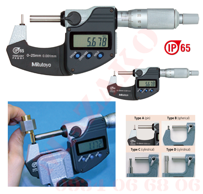 Panme do chieu day thanh ong mitutoyo loai dien tu do chia 0.001mm khoang do 0-25mm 395-261, 395-262, 395-263, 395-264, 395-362, 395-363, 395-364, loai co do chia 0.01mm khoang do 0-25mm 115-302, 115-308, khoang do 25-50mm 115-303, 115-309... xuat xu Nhat Ban.